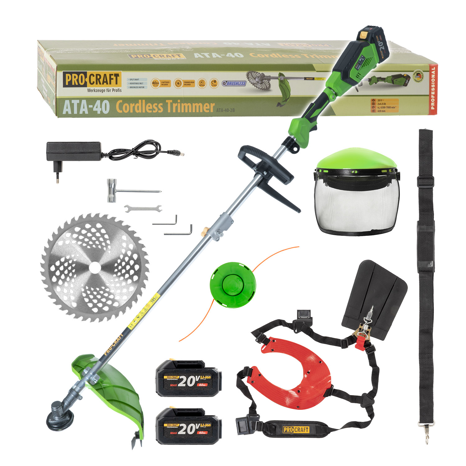 Aku krovinorez Procraft ATA-40 + dvojramenný popruh a ochranný štít | ATA-40/20SH/CH/FACE-GUARD