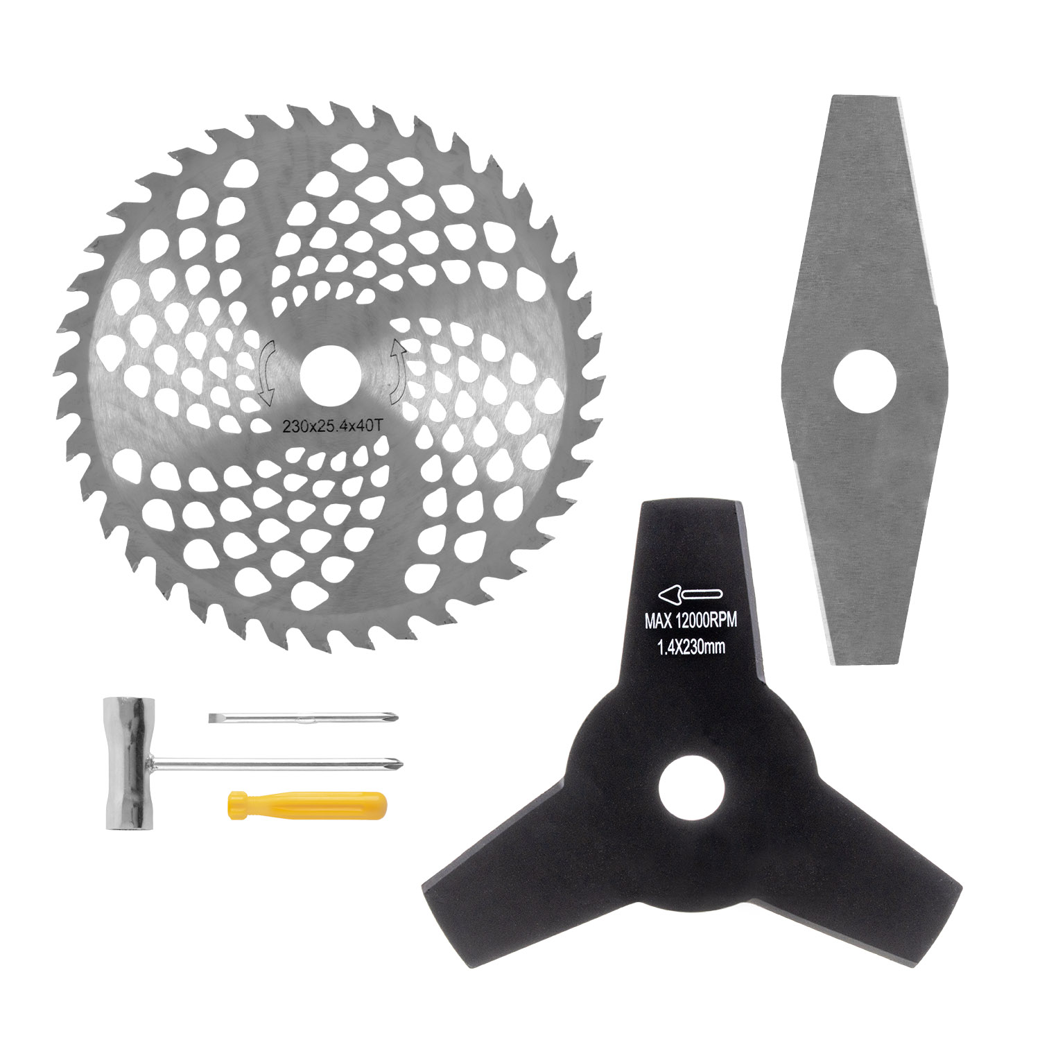 Bezuhlíkový motor. Súčasťou balenia sú 1× batéria 20V 3Ah, nabíjačka, 2× oceľové nože, 1× kotúč, 1× strunová hlava a 2× struny. Hmotnosť 2,4 kg, otáčky 5000/min. Pracovný záber (mm) 230. Priemer rúry (mm) 25.