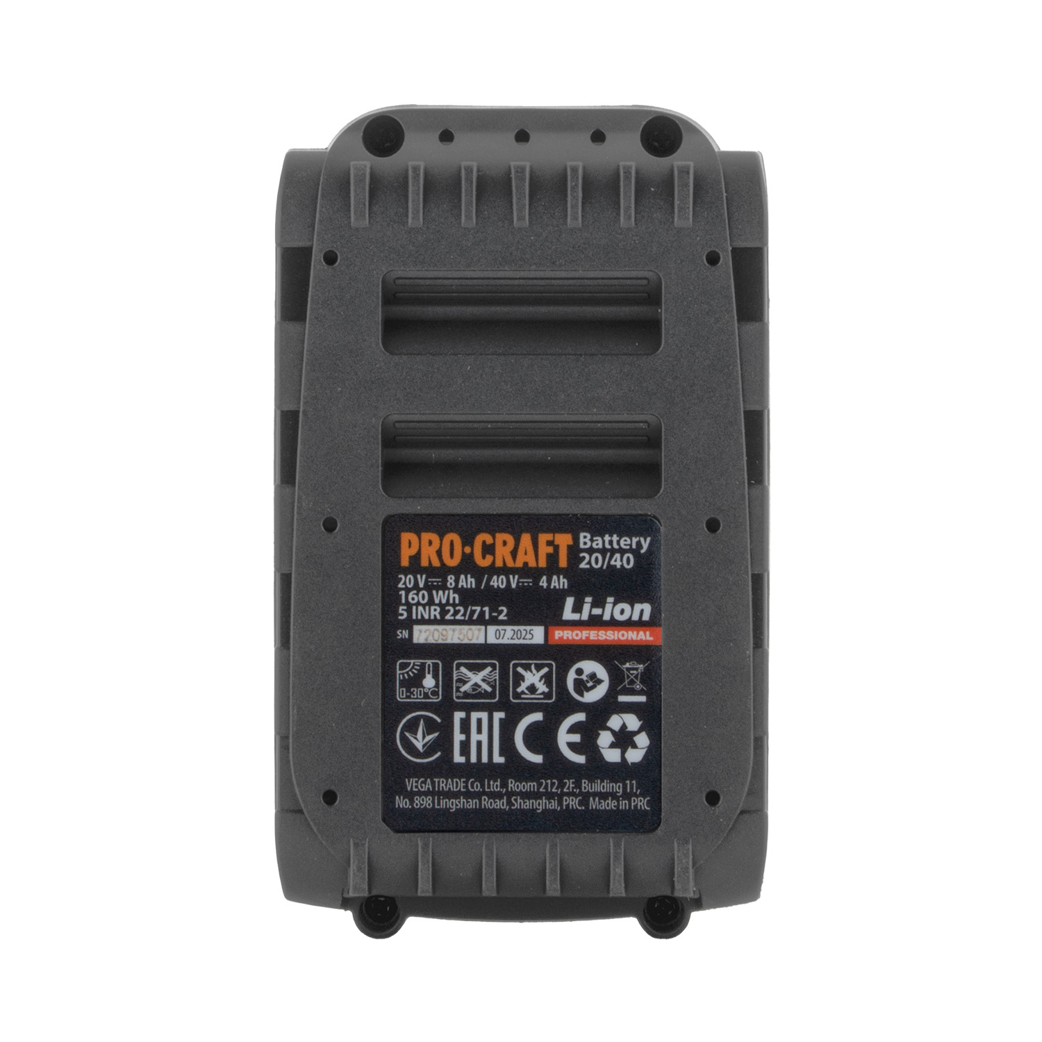 Procraft 20/40 je univerzálna a výkonná batéria, ktorá zjednodušuje prácu so všetkými strojmi Procraft. Je ideálnou voľbou pre používateľov, ktorí chcú využívať jeden akumulátor pre rôzne náradie a zároveň očakávajú vysokú kapacitu, bezpečnosť a spoľahlivosť.