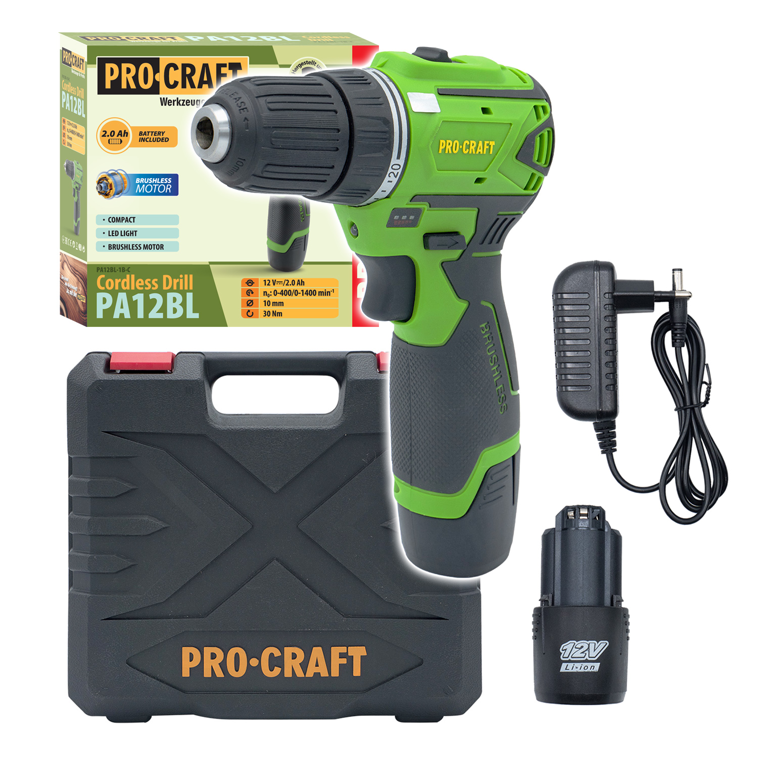 Vŕtací skrutkovač AKU Procraft PA12BL je praktický nástroj na použitie všade tam, kde nechcete byť pri vŕtaní a skrutkovaní obmedzovaní elektrickým káblom. Skrutkovač s pravým/ľavým smerom otáčania a uťahovacím momentom až 30 Nm je vhodný na skrutkovanie skrutiek, matíc a skrutiek s 1/4" nástavcami. Uťahovací moment nastaviteľný v rozsahu 20 stupňov. Rýchloupínacie skľučovadlo umožňuje upínanie vrtákov a stopkových nástrojov s priemerom do 10 mm. Skrutkovanie na 1. a vŕtanie na 2. prevodovom stupni možno vykonávať s plynulou reguláciou otáčok. Stroj je vybavený integrovaným LED osvetlením pracovnej plochy s funkciou dosahu. Súčasťou dodávky je 1 akumulátor 12V 2Ah, nabíjačka a prepravný plastový kufor.