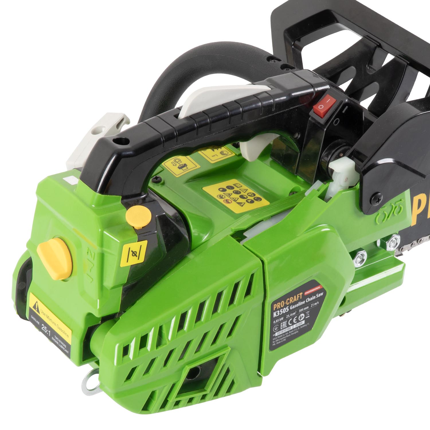 Procraft K350S benzínová reťazová píla Objem motora 25 (cm3) Výkon 850 (W) Typ motora: jednovalcový dvojtaktný motor Dĺžka lišty 300 (mm) Objem palivovej nádrže (ml) 230 Objem olejovej náplne (ml) 160