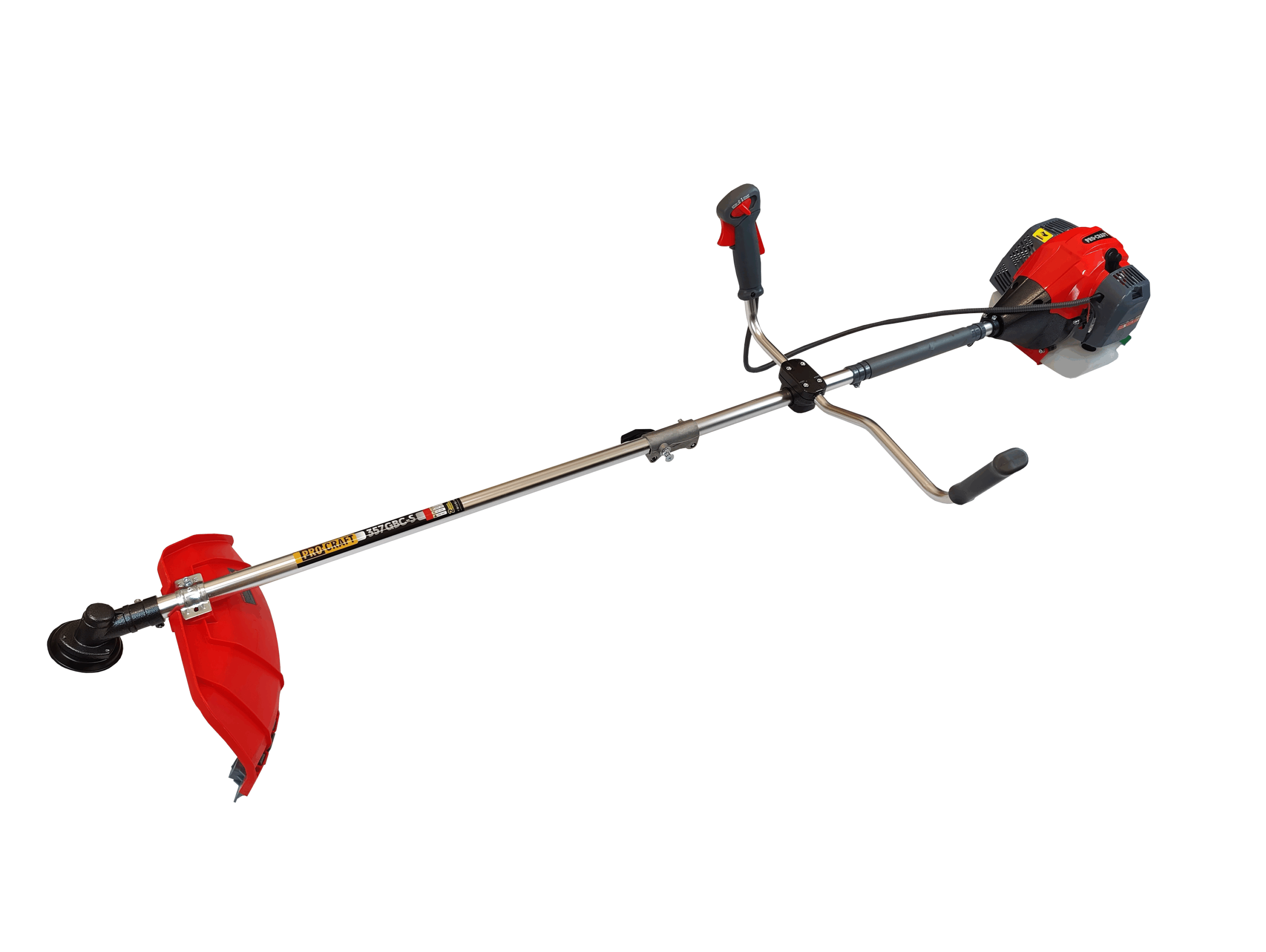 Benzínový krovinorez Procraft 357GBC je určený na kosenie a vyžínanie trávnikov, odstraňovanie drobných drevín s priemerom do 1,5 cm. Ovládanie vyhadzovania struny je poloautomatické. Súčasťou dodávky je 3x strunová hlava s kovovým dnom, pílový kotúč na drevo, 3-zubý kotúč, ochranná maska, rezná struna, nádoba na miešanie paliva, dvojitý popruh a sada kľúčov. Lišta s priemerom 28 mm a 9. hviezda zabezpečujú dlhšiu životnosť prevodovky. Predpísaná zmes oleja a benzínu je 1:40 (1:25 pri zábere) Kartónové balenie.