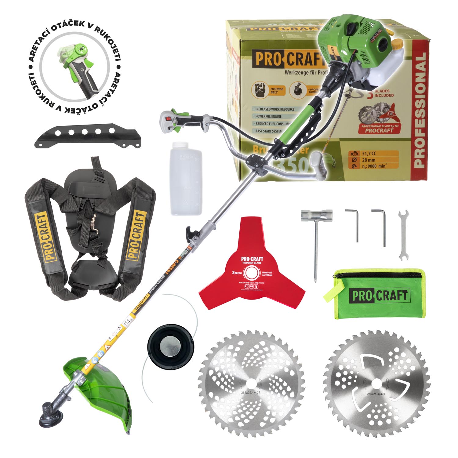 Benzínový krovinorez Procraft TP4350 je určený na kosenie a vyžínanie trávnatých plôch, odstraňovanie drevnatého porastu do hrúbky 2 cm. Výkonný dvojtaktný motor s objemom 52 cm3 a 9000 otáčkami za minútu zaručuje dlhú bezproblémovú prevádzku a vysoký výkon. Ovládanie vyhadzovania struny je poloautomatické. Súčasťou dodávky je 1x bežecká hlava, 2x pílový kotúč na drevo, 3. zubový kotúč, ochranná maska, rezná struna, nádoba na palivovú zmes, dvojramenný popruh a sada kľúčov. Priemer lišty 28 mm a 9,hviezdicová os v zaručujú dlhšiu životnosť prevodovky. Predpísaná zmes oleja a benzínu je 1:40 (1:25 pri zábehu) Kartónové balenie.