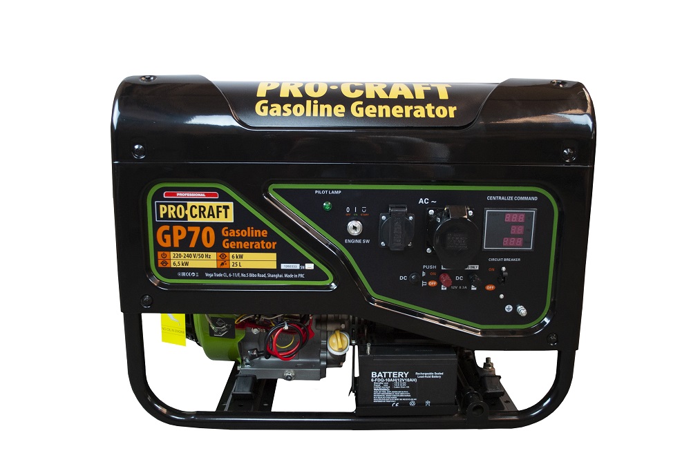 Elektrický generátor Procraft GP70 je určený na použitie ako nezávislý generátor energie počas výpadkov elektrického prúdu, ako zdroj energie v stavebníctve, v domácnosti, kde nie je k dispozícii elektrická sieť. Vďaka vysokému výkonu dokáže napájať nielen domáce spotrebiče, ale aj spotrebiče indukčného typu. Generátor energie má palivovú nádrž s objemom 25 l, čo zaručuje dlhú nepretržitú prevádzku. Elektronický štart zabezpečuje rýchle naštartovanie benzínového motora. Robustný ochranný rám umožňuje používanie elektrocentrály v akýchkoľvek podmienkach a uľahčuje aj jej prepravu. Súčasťou dodávky je elektrická zástrčka, 2 rukoväte, 2 kolieska, kľúč na zapaľovaciu sviečku. Kartónové balenie.