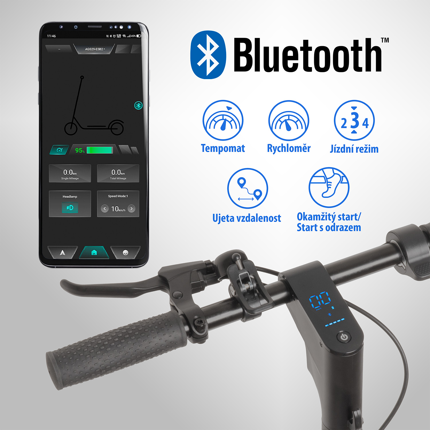 Kolobežku je možné prepojiť s inteligentnou mobilnou aplikáciou Scootor, ktorá umožňuje prepínanie jazdných režimov a sledovanie štatistík jazdy. Vďaka Bluetooth pripojeniu máte kontrolu nad jazdou priamo vo svojom mobile.