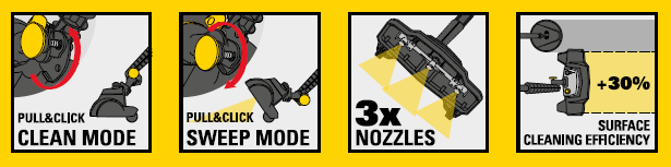 • Využíva synergiu 3 trysiek, štetín a čistiaceho prostriedku na odstránenie odolných nečistôt z podláh.