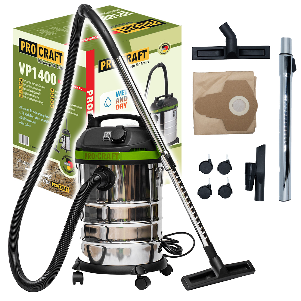 Priemyselný vysávač Procraft VP1400 je určený na mokré a suché vysávanie, na čistenie interiéru automobilov, dielní a domácností. Výkonný 1400W motor poskytuje vysoký sací výkon 17 kPa a je vhodný ako ručný vysávač na elektrické náradie. Poradí si s rozliatou vodou, ktorú vysaje do nádoby (čistenie kobercov). Rýchloupínacie klipy uľahčujú výmenu vreciek. Prácu vám uľahčí systém automatického spínania s integrovanou 230V zásuvkou vrátane funkcie časovača. Súčasťou dodávky je sacia hadica, teleskopická kovová trubica, hubica, vrecká a kolieska. Kartónové balenie.