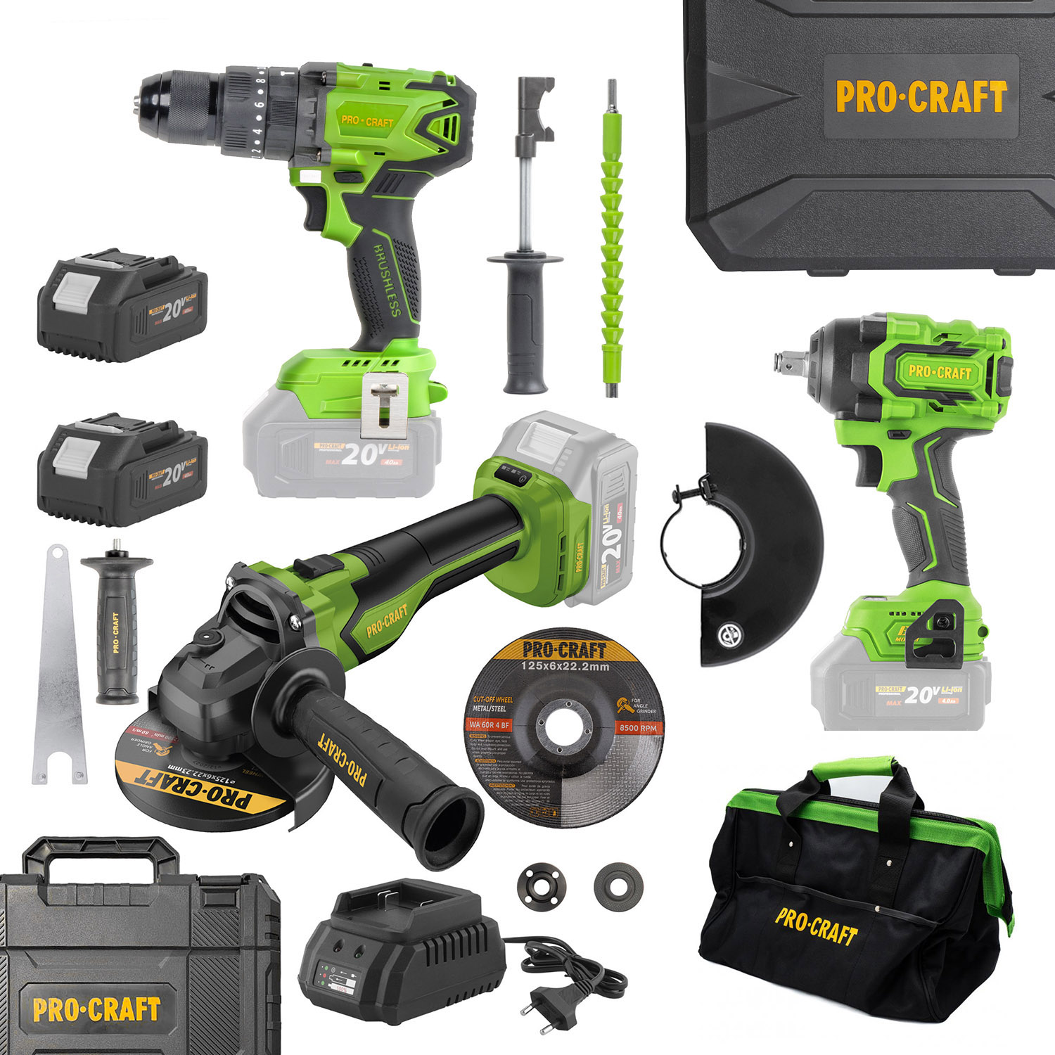 Procraft aku sada náradia 20V obsahuje 5 dielov: rázový uťahovač, aku skrutkovač, uhlovú brúsku, batériu 20V 4Ah, nabíjačku a tašku na náradie. Stroje s bezuhlíkovým motorom, ideálne pre profesionálne aj domáce použitie.