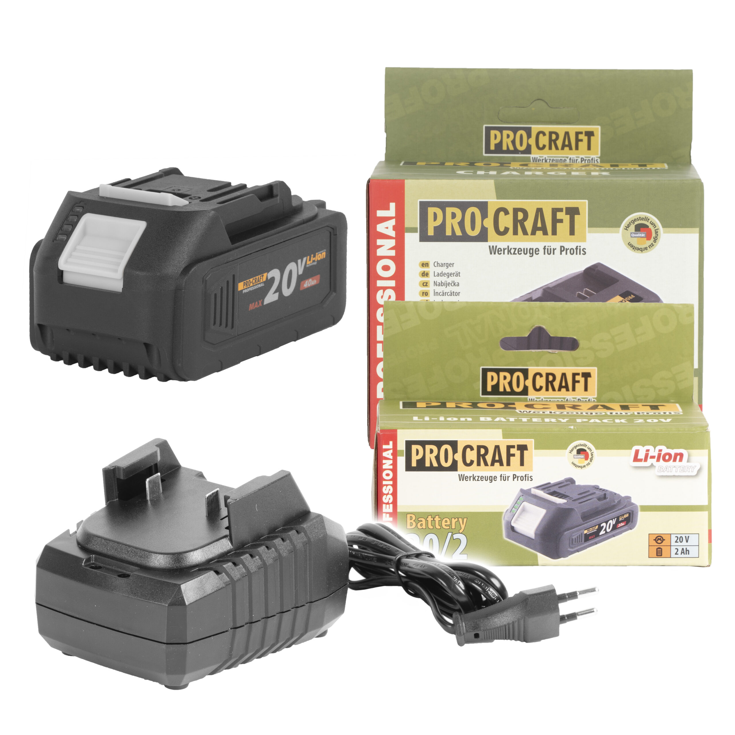 Sada obsahuje jednu batériu Procraft 20V 4Ah s ochranou proti prehriatiu a vybitiu a nabíjačku. Ideálny doplnok pre neprerušovanú prácu s aku náradím Procraft.