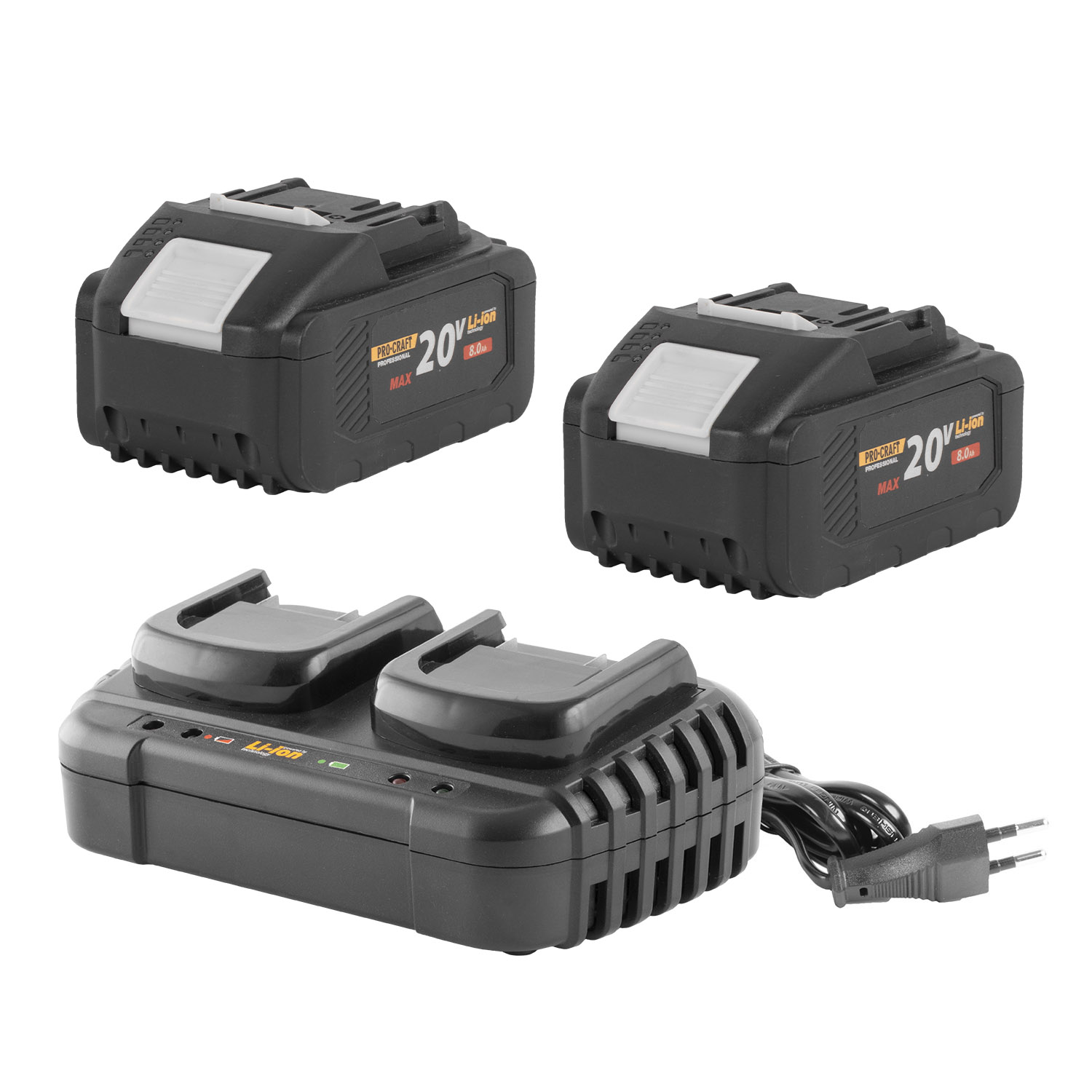 Súčasťou je tiež nabíjačka Procraft 20/2 pre dve batérie, ktorá zabezpečuje rýchle a bezpečné nabíjanie akumulátorov, takže môžete pracovať plynule a bez zbytočných prestojov.