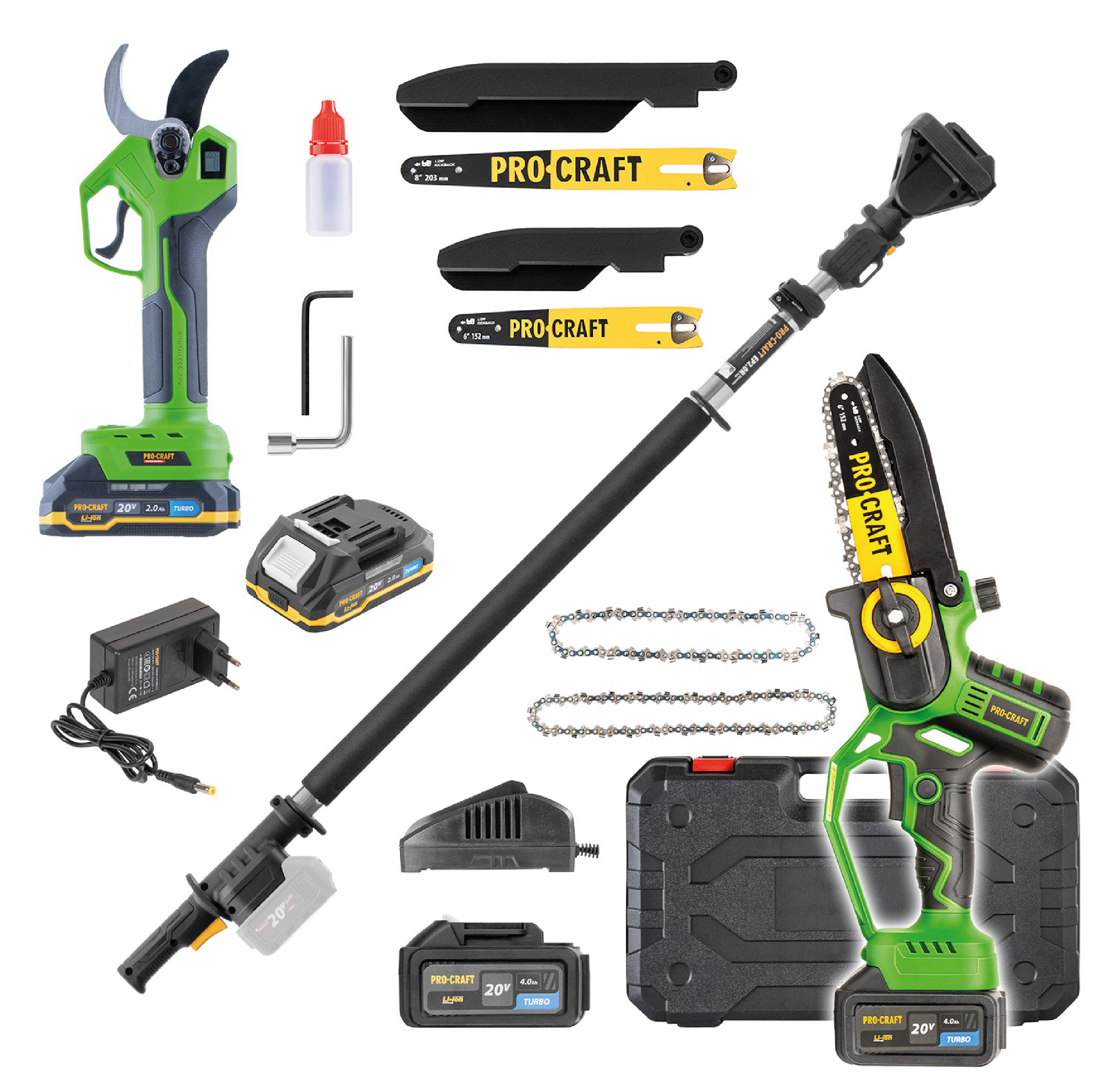 Sada Procraft PKA32Li + ES32Li + EP2.0R obsahuje aku reťazovú pílku, aku nožnice na konáre a predlžovací nadstavec. Náradie je vybavené bezuhlíkovým motorom a ponúka vysoký výkon. Balenie obsahuje: 2× batériu (20 V 4 Ah a 20 V 2 Ah), 2× kufor, 2× lištu a 2× reťaz.
