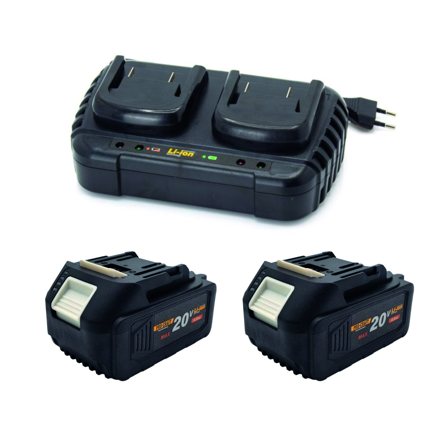 Sada dvoch batérií 20 V 4 Ah Procraft 20/4 a nabíjačka na dve batérie 20/2