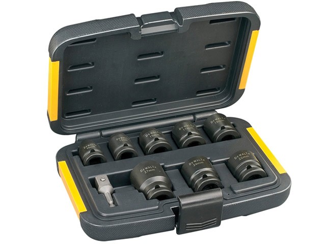 9-dielna súprava kľúčov pre rázový uťahovač – nástrčkové kľúče 10, 13, 15, 17, 19, 22, 24, 27 mm, adaptér 1/4″ na 1/2″