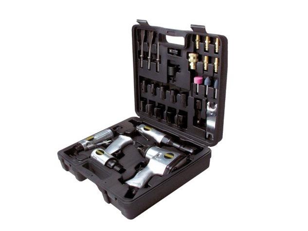 Zahrnuté príslušenstvo 1/2” rázový uťahovák – račňový kľúč so sadou hlavíc a predĺžení – pneumatické kladivo s 3 sekáčmi – brúska s 3 brúsnymi kotúčmi