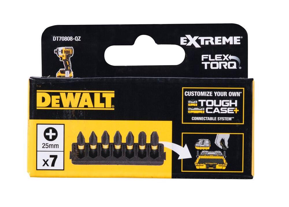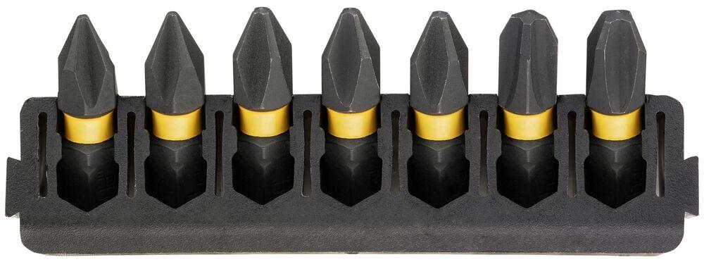 Držiak na 7 ks 25 mm bitov. Bity FLEXTORQ: PH1 (x2), PH2 (x3), PH3 (x2).