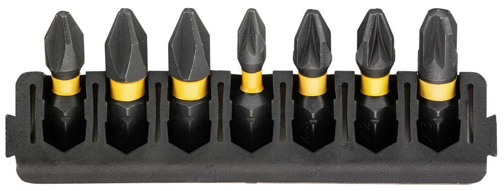 Držiak na 7 ks 25 mm bitov. Bity FLEXTORQ: PH1 (x1), PH2 (x2), PZ1 (x1), PZ2 (x2), PZ3 (x1).
