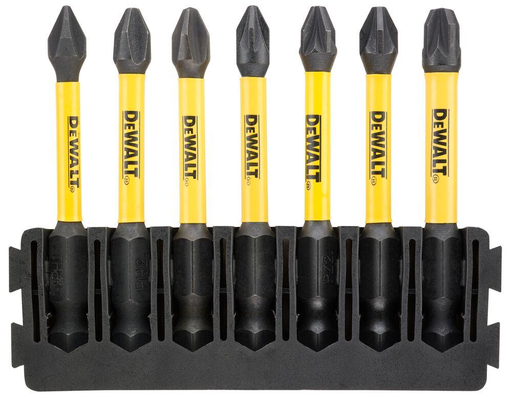 Držiak na 7 ks 57 mm bitov. Bity FLEXTORQ: PH1 (x1), PH2 (x2), PZ1 (x1), PZ2 (x2), PZ3 (x1).