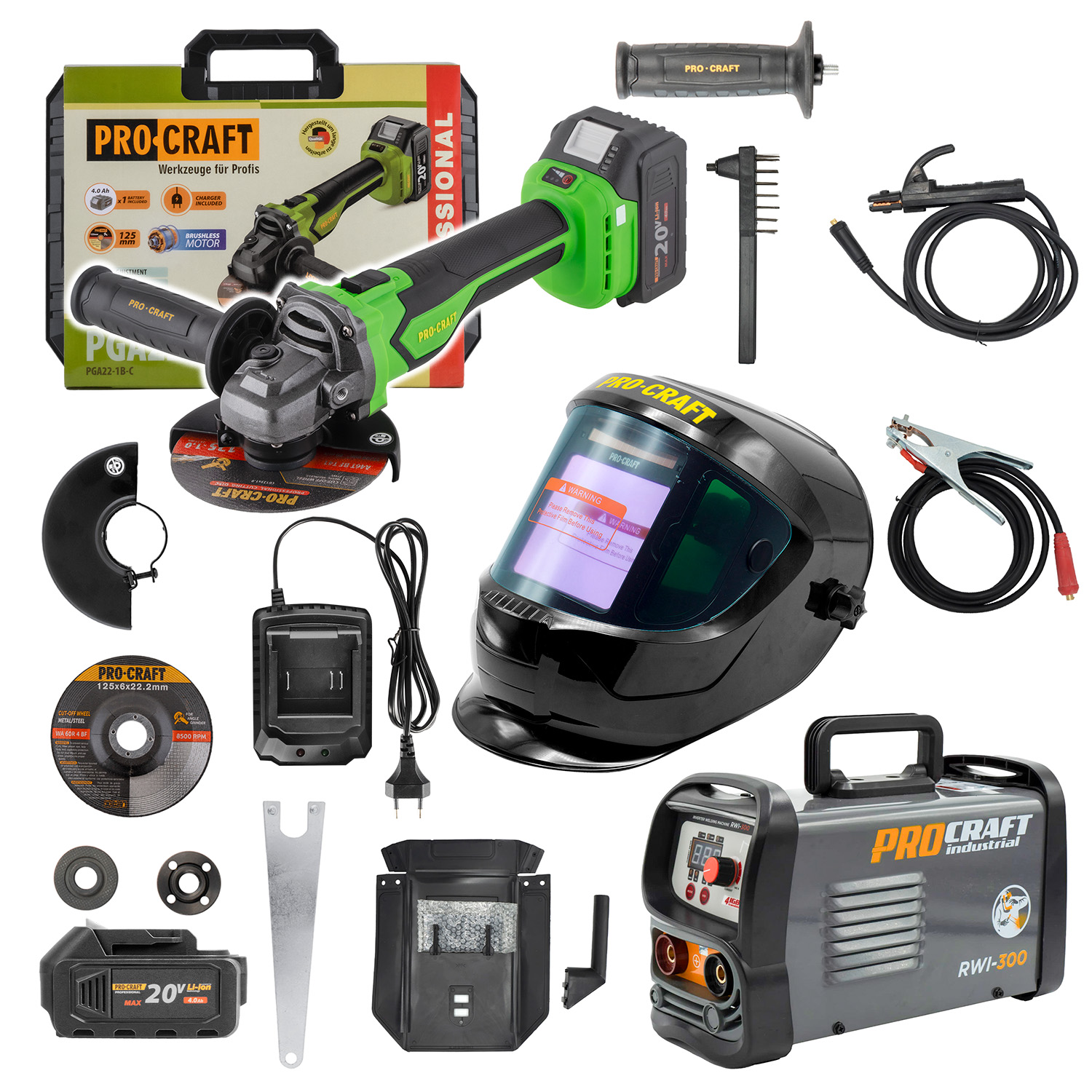 Kompletná zváracia a brúsna sada Procraft predstavuje ideálne riešenie pre dielňu, stavbu aj náročnejšie domáce použitie. Kombinuje výkonný invertor RWI-300, aku bezuhlíkovú uhlovú brúsku PGA22 a profesionálnu samostmievaciu kuklu SPH1000. Všetko potrebné na zváranie, brúsenie aj finálnu úpravu zvarov v jednom balení.