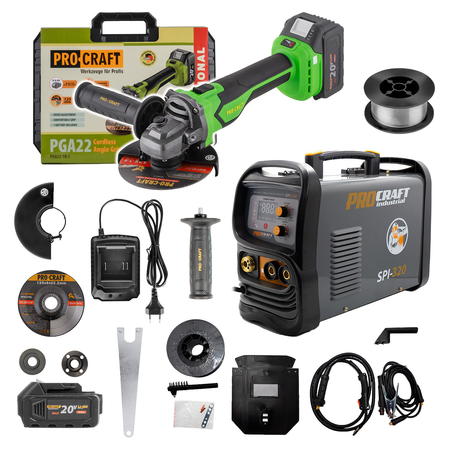 Kompletná profesionálna sada určená na zváranie aj následnú úpravu materiálu. Výkonný poloautomatický invertor SPI-320, bezuhlíková aku uhlová brúska PGA22 a trubičkový FLUX drôt FW81 tvoria ideálnu kombináciu pre dielňu, stavbu aj montážne práce. Sada je pripravená na okamžité použitie.