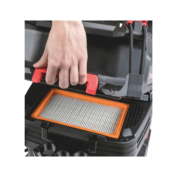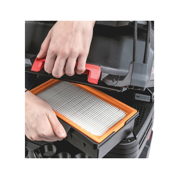 • Plochý skladaný filter sa automaticky čistí prúdom vzduchu v súlade so zvoleným intervalom (15 alebo 60 sekúnd).