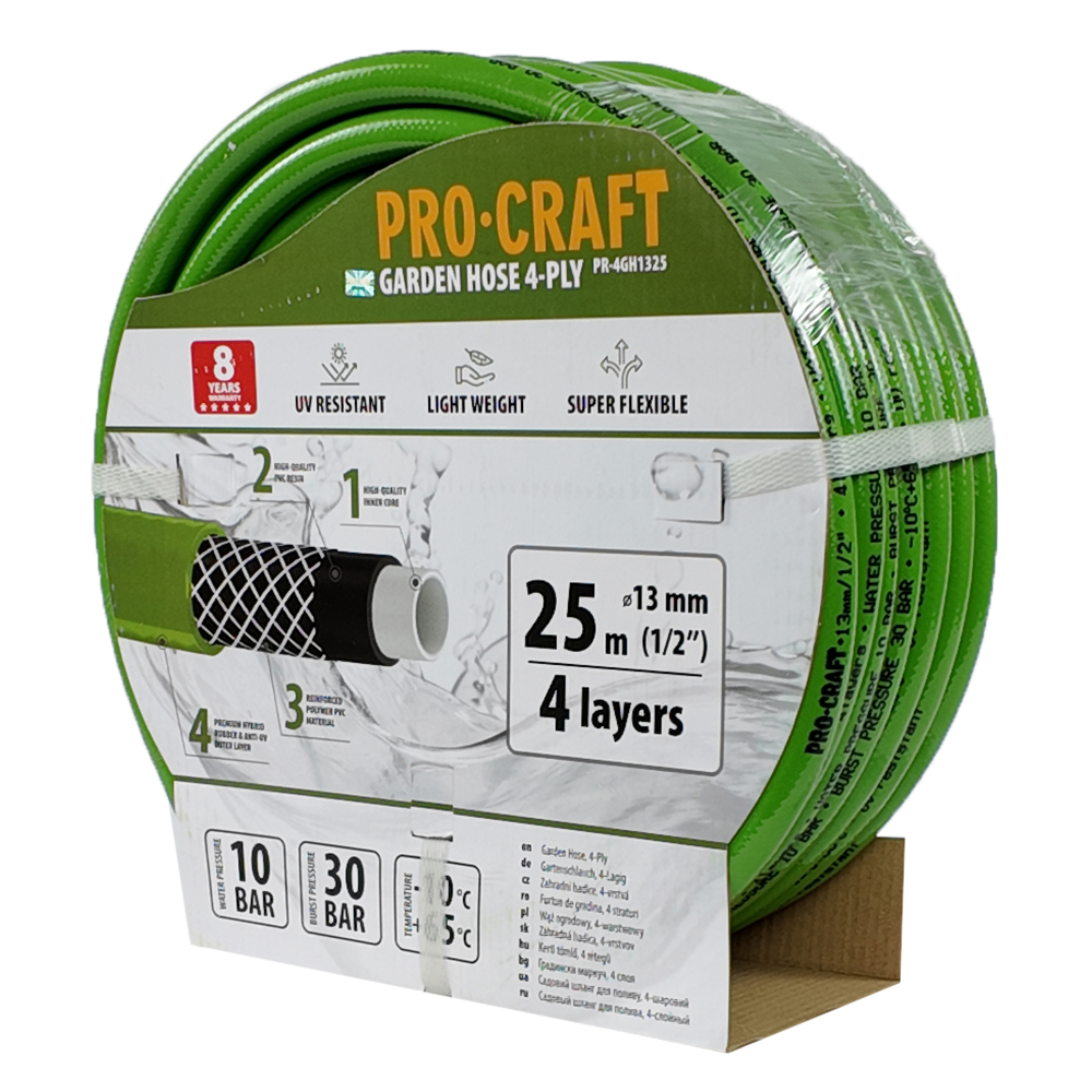 Záhradná hadica Procraft je určená na zavlažovanie a polievanie záhrad, pozemkov. Zosilnená 4-vrstvová záhradná hadica s tkanou výstužou má dlhú životnosť až 8 rokov. Kvalitné spracovanie hadice zaručuje vysokú odolnosť voči UV žiareniu, poveternostným vplyvom a teplotám (-10 až +65). Hadica je veľmi pružná, pevná a odolná voči poškodeniu.