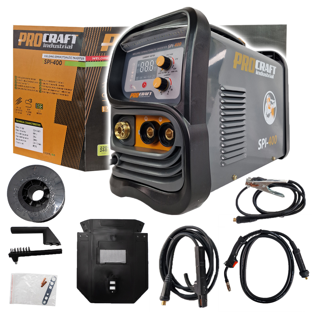 Zvárací invertor Procraft SPI-400 je určený na ručné zváranie metódou MIG a MAG. Výkonové tranzistory IGBT zaručujú dlhú bezporuchovú prevádzku. Regulácia zváracieho prúdu v rozsahu 20-200 A umožňuje nastavenie optimálnych parametrov pri práci s rôznymi kovmi. Možno použiť zvárací drôt s priemerom 0,6 až 1,0 mm. umožňuje zváranie inertnými alebo aktívnymi plynmi. Na LCD displeji sa zobrazuje aktuálny zvárací prúd. Súčasťou dodávky je zvárací drôt 0,8 mm (5 kg bubon), MIG horák s káblom, zvárací štít, kábel s držiakom elektród, kábel s uzemňovacími kliešťami a drôtená kefa kombinovaná so struskovým kladivom. Balenie v kartóne.